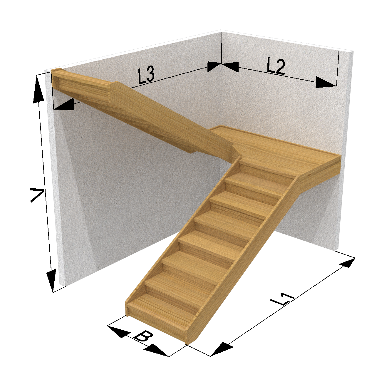 Messen Sie die Größe der Bauöffnung (meistens rechteckig) und bestimmen Sie anhand dessen die Breite der Treppe; wir empfehlen mindestens 1 m. Ist der obere Lauf L2 kürzer als 2 m, achten Sie darauf, dass das Treppenauge nicht zu schmal wird, damit zwischen Anlauf- und Austrittslauf ein Abstand von mindestens 40 mm für die Fingerfreiheit am Handlauf bleibt. Befindet sich der Austrittslauf dicht an Wänden oder der Decke, achten Sie ebenfalls auf ausreichend Platz für die Finger entlang des zukünftigen Handlaufs. Die Bauöffnung kann sehr unterschiedlich geformt sein – in diesem Fall ist es sinnvoll, sie zunächst maßstabsgetreu auf Papier zu skizzieren und alle Maße anhand dieser Zeichnung zu überprüfen.
